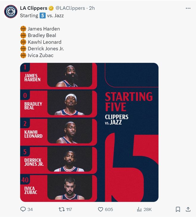 最终,哈登29分钟15分11助攻,小卡29分钟9中3拿10分,比尔20分钟5分,祖巴茨27分钟19分6篮板,琼斯17分钟12分。