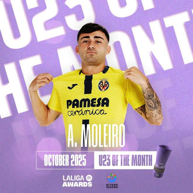 雷速体育10月30日讯 西甲联赛官方宣布,22岁的比利亚雷亚尔前锋莫里罗当选10月份联赛最佳U23球员。