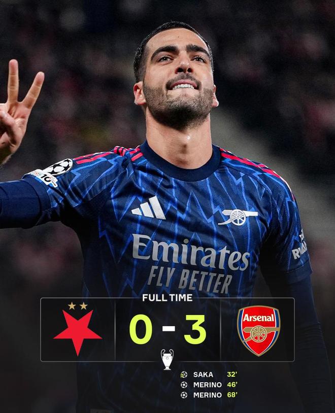 第68分钟,斯拉维亚门将马尔科维奇出现低级失误,皮球直接被梅里诺断下,后者推射空门得手,阿森纳3-0遥遥领先;梅里诺梅开二度,枪手基本锁定胜局,最终比分也定格在此,本场枪手获胜手,创下了几大纪录: